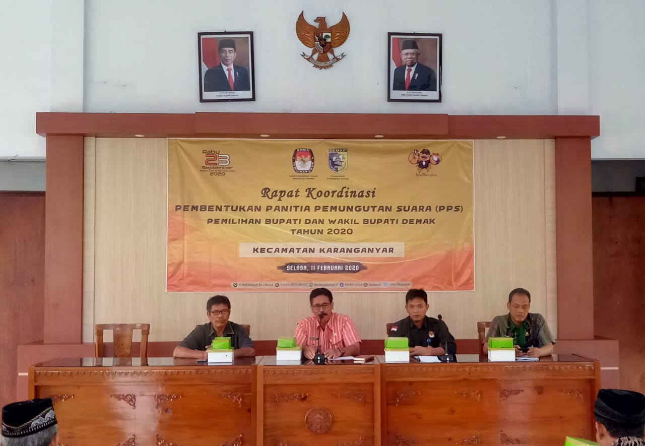 Rapat pembentukan panitia pemungutan suara (PPS) Pemilihan Bupati dan Wakil Bupati Demak Tahun 2020 dilaksanakan di Kantor Kecamatan Karanganyar pada Hari Selasa, 11 Pebruari 2020 pada pukul 09.00 WIB -11.00 WiIB dengan pimpinan rapat Bapak Abdul Azis dari KPU Demak
