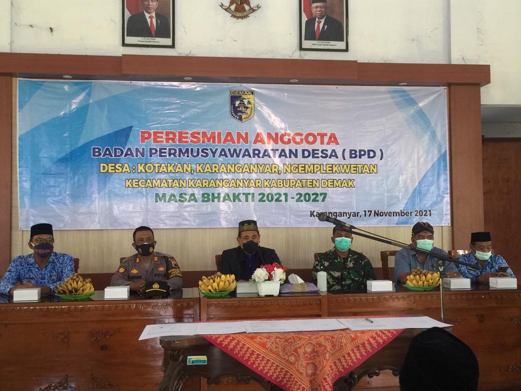 Pelaksanaan Peresmian tersebut pagi hari di Aula Kecamatan Karanganyar dengan disaksikan Forkopimda, Tokoh masyarakat, tokoh pemuda dan juga oleh Kepala Desa masing-masing, sesuai dengan jumlah kewilayahan dari ke 3 desa tersebut adalah Desa Karanganyar 9 Orang, desa Kotakan 7 Orang dan desa Ngemplik wetan jumlah 5 orang. Dan selanjutnya Camat Karanganyar atas nama Bupati Demak memandu pelaksanaan Sumpah dan janji Anggta BPD terpilih tersebut.